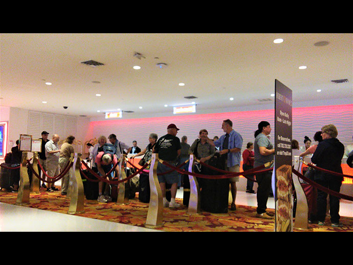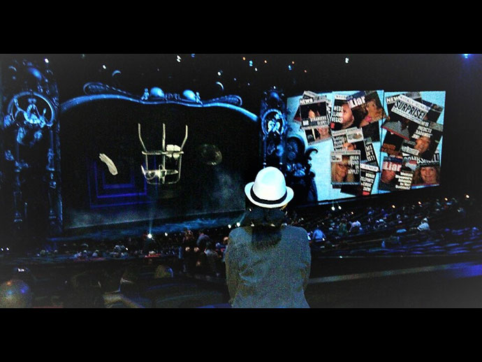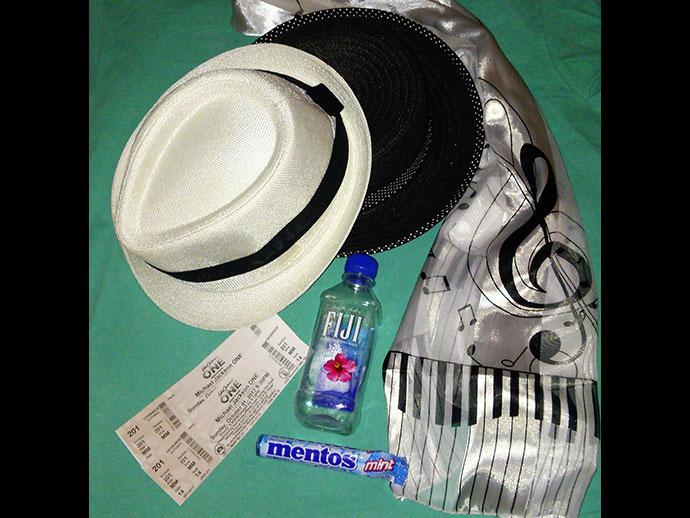 ระหว่างรอเข้าโรงละครได้แวะเข้าไปในร้านขายของที่ระลึก ซื้อหมวก M.J. มาใส่ให้เข้ากับบรรยากาศ หย่อนใบเก่าที่ใส่อยู่ไปในถุงแทน หมวก M.J.ที่ซื้อมาใส่เพื่อความเก๋ไก๋นี้กลับกลายเป็นสิ่งจำเป็นที่ได้ใช้ประโยชน์ทั้งคืน ภายในโรงละครเปิดเครื่องทำความเย็นสูงมากจนเย็นยะเยือก ส่วนเงาประจำตัวที่ไม่เคยร้อนไม่เคยหนาวกับใครเขา คราวนี้ถึงกับออกปากเพราะใส่เสื้อเชิ๊ตไปเพียงตัวเดียว อากาศที่ลาสเวกัสระยะนี้สบายมาก ไม่ได้นึกว่าจะต้องมานั่งเฉยๆอยู่บนเก้าอี้ตั้งแต่ ๓ ทุ่มครึ่งจนตี ๒ ครึ่ง แล้วยังต้องระหกระเหินไปทั่วเมืองเวกัสทั้งคืน สรุปแล้วเงาประจำตัวเลยใส่หมวกใบเก่าของ ส.ท่าเกษม ซึ่งช่วยป้องกันความหนาวเย็นได้อย่างดี ส่วนคุณผู้หญิงไปไหนมาไหนน่าจะนำผ้าพันคอติดตัวไปด้วย ในยามฉุกเฉินช่วยได้มากทีเดียวถึงแม้นจะดูบางเบา แต่ถ้าใช้พันรอบลำคอหลายๆทบก็ช่วยให้ความอบอุ่นได้เหมือนกัน