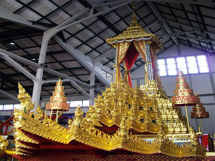 พระมหาพิชัยราชรถ เป็นราชรถที่ทำด้วยไม้สักทอง ปิดกระจกและทองคำเปลวบริสุทธิ์ รายรอบบุษบกเป็นพระยานาคและมีรูปของเทวดา (เทพนม) อยู่ด้านล่าง มีการย่อมุมไม้สิบสอง โดยจะเก็บไว้ที่โรงเก็บราชรถ แต่ที่บริเวณประตูนั้น จะมีการสร้างปูนให้สูงขึ้นมาเล็กน้อย เปรียบเสมือนเป็นธรณีประตู เพื่อคราใดที่ต้องใช้งาน จะมีการทุบทำลายกำแพงปูนนี้ และเมื่อใช้เสร็จแล้ว จะมีการก่อกำแพงปูนขึ้นมาใหม่ เพื่อเป็นเคล็ดที่ว่าราชรถที่เก็บในโรงเก็บราชรถ จะได้ไม่ต้องออกไปอีก เปรียบว่าจะไม่มีพระราชวงศ์องค์ใดสิ้นอีก