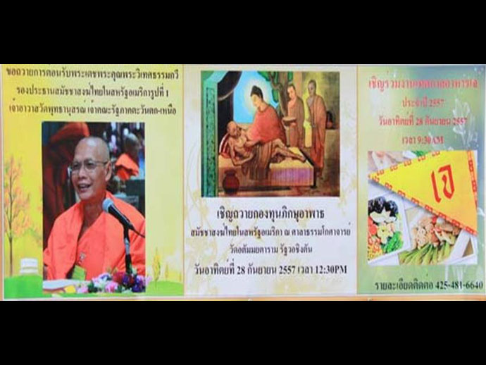 ซึ่งจะเดินทางมารับการถวายกองทุนภิกษุอาพาธ ในนามสมัชชาสงฆ์ไทยในสหรัฐอเมริกา ณ ศาลาธรรมโกศาจารย์ วัดอตัมมยตาราม รัฐวอชิงตันในวันอาทิตย์ที่ ๒๘ กันยายน ๒๕๕๗ เวลา ๑๒.๓๐ น. จึงใคร่ขอเรียนเชิญท่านผู้มีจิตศรัทธาทุกท่านเข้าร่วมกิจกรรมในครั้งนี้ตั้งแต่เช้าเวลา ๐๙.๐๐ น. เป็นต้นไป........* และพุทธศาสนิกชนและชุมชนคนไทยในเมืองแวนคูเวอร์ ประเทศแคนาดาได้ร่วมกันจัดงาน