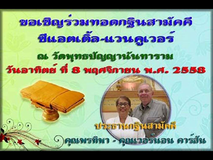 คุณ Vernon Carlson จะเป็นประธานนำผ้ากฐินสามัคคีเดินทางขึ้นไปทอดให้แก่วัดพุทธปัญญานันทารามที่นครแวนคูเวอร์ ประเทศแคนาดาในวันอาทิตย์ที่ ๘ พฤศจิกายน........* เกิดวันที่ ๑๑ ตุลาคม