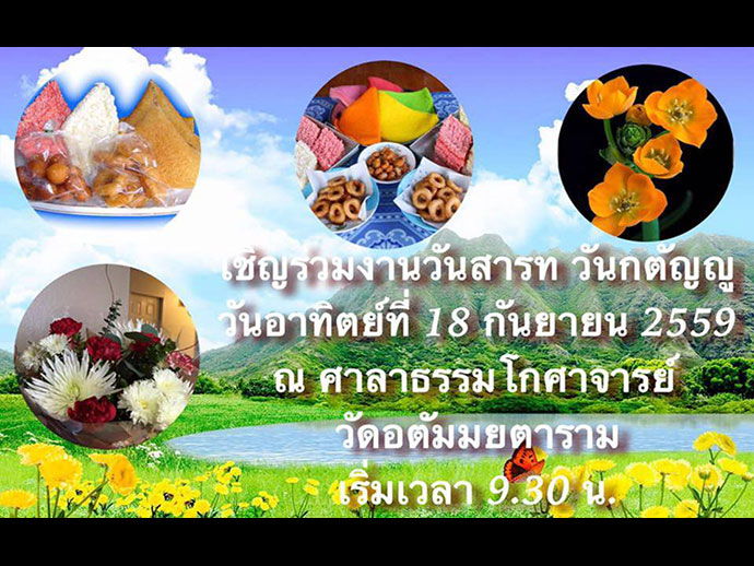 วันสารทไทย ณ ศาลาธรรมโกศาจารย์ วัดอตัมมยตารามตั้งแต่เวลา ๐๙.๓๐ น. ขอเชิญทุกท่านที่มีโอกาส ไปร่วมงานบุญวันสารทตามประเพณีไทยที่เราได้รักษาสืบทอดกันมา........* ส่วนอาทิตย์ต้นเดือน วันอาทิตย์ที่ ๒ ตุลาคม จะเป็นกิจกรรม