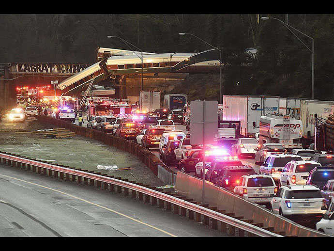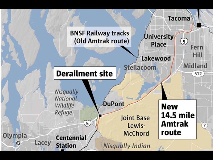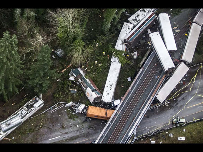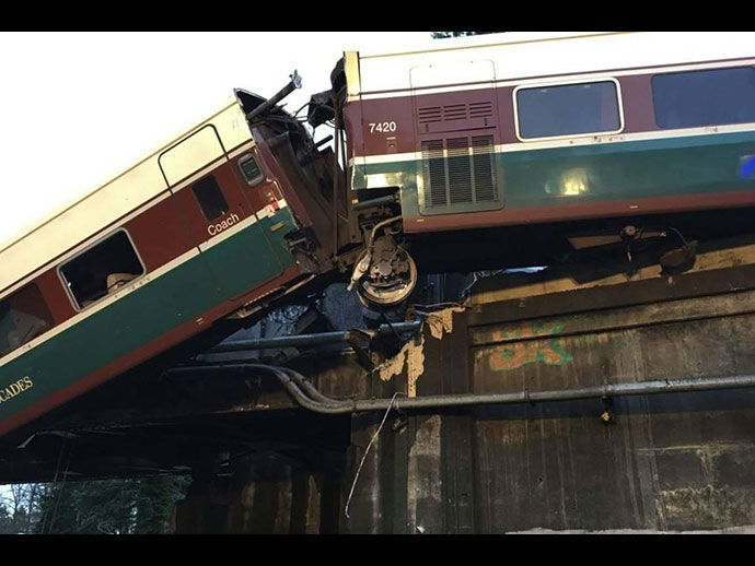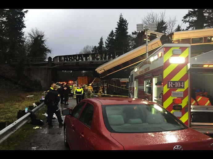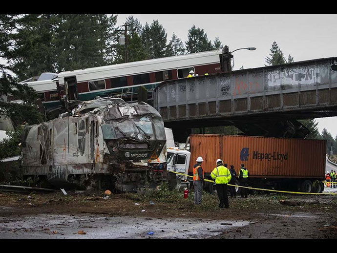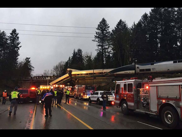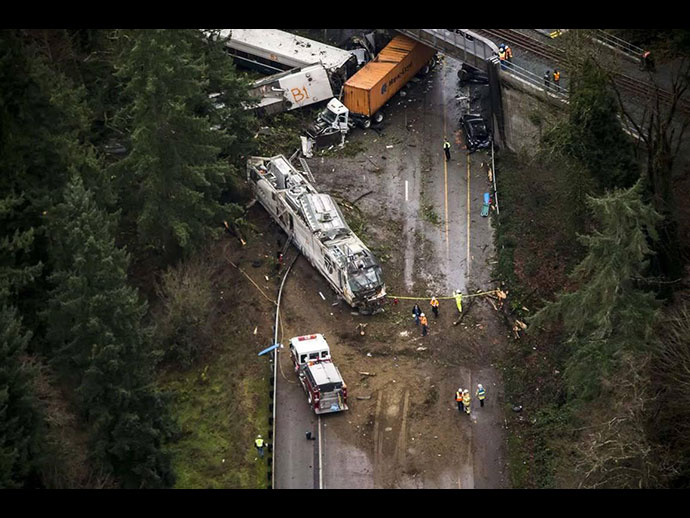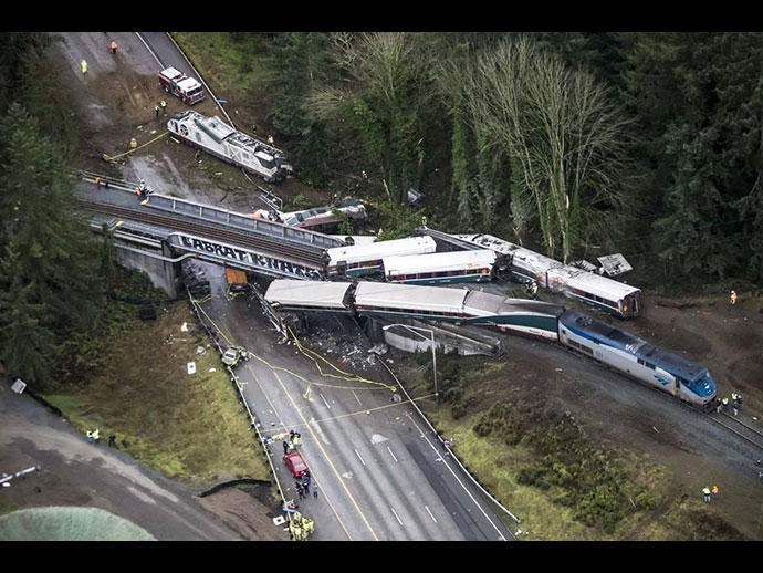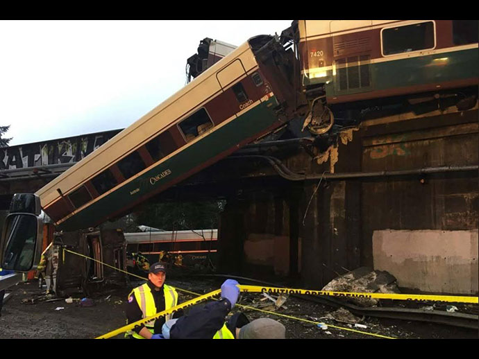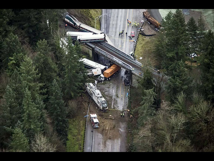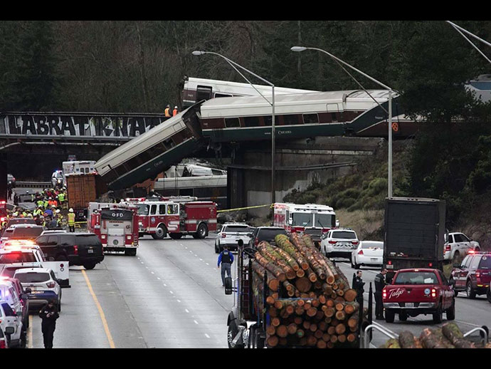 ขบวนรถไฟความเร็วสูงเที่ยวปฐมฤกษ์ต้อนรับเส้นทางตัดตรงเลาะริมทางฟรีเวย์สาย I-5 ที่จะย่นระยะทางจากเดิมลงกว่า ๔๐ นาทีจากซีแอตเติ้ลรัฐวอชิงตันลงสู่เมืองพอร์ตแลนด์รํฐออเรกอนเกิดตกรางเกือบทางขบวนหลังออกจากแวะรับส่งผู้โดยสารที่สถานีทาโคม่าได้เพียงชั่วครู่เมื่อเวลา ๐๗.๔๑ นาทีของเช้าวันจันทร์ที่ ๑๘ ธันวาคม แถมตู้ระไฟหลายตู้ยังได้เทกระจาดบงเกลื่อนกลางฟรีเวย์สาย I-5 ขาล่องจนต้องปิดการจราจรขาล่องทุกช่องทางจนกระทั่งมาเริ่มเปิดได้ ๒ ช่องทางเมื่อเวลา ๑๗.๐๐ น.ของเย็นวันพุธที่ผ่านมา........* เกิดสัปดาห์ที่ผ่านมา...