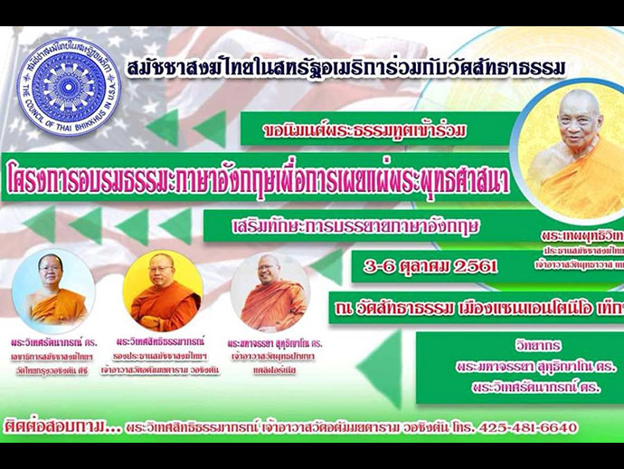 “วันสารท” (Ancestor Day) ในวันอาทิตย์ที่ ๗ ตุลาคม ๒๕๖๑ ณ วัดอตัมมยตาราม เริ่มตั้งแต่เวลา ๐๙.๓๐ น. สวดมนต์ และนั่งสมาธิภาวนา ๑๐.๓๐ น. ธรรมเทศนา ๑๑.๐๐ น. ตักบาตร ถวายภัตตาหารเพล และรับประทานอาหารร่วมกัน ๑๓.๐๐ น. พิธีสวดบังสุกุล สอบถามเพิ่มเติมรายละเอียดได้ที่ พระวิเทศสิทธิธรรมาภรณ์ (อาจารย์ฤทธิ์) หมายเลขโทรศัพท์ (425) 481-6640.........· เกิดสัปดาห์นี้