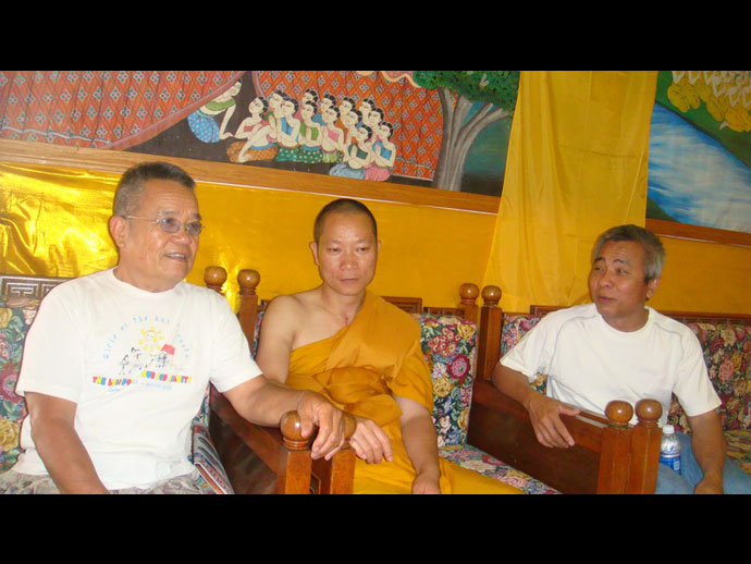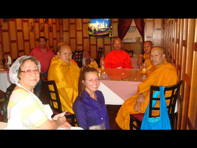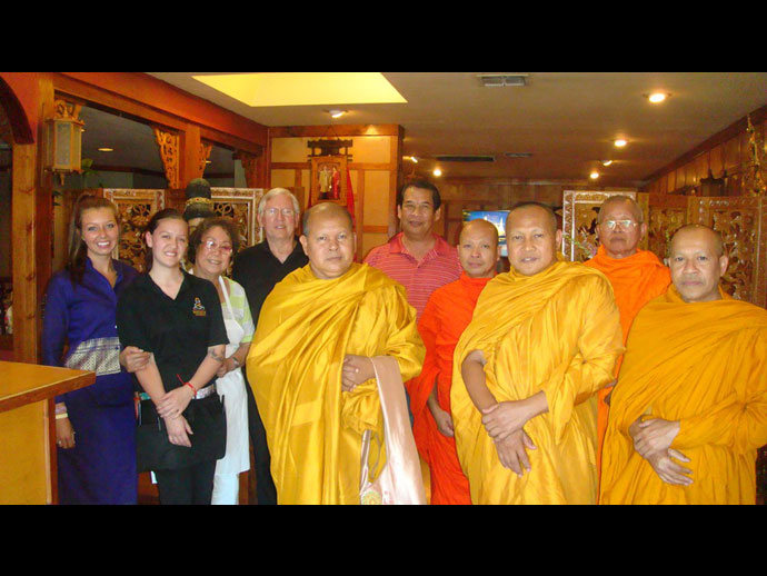 @@@.บุญอย่างมีเหตุ มีผล บุญหล่นทับชาวไทยหลายเมือง พี่วีรชน – กฤตยา ศรีประยูร หรือรู้จักกันในนามพี่จิ๋ว เจ้ากิจการร้านอาหารไทย Thai Bristho !! เมืองมอนเทอร์เลย์ ทราบว่า ท่านพระครูวรสิทธิวิเทศ หรือท่านพระอาจารย์พระมหาสิทธิพร แห่งวัดพุทธประทีป ซานฟรานซิสโก ปัดฝุ่นโครงการในเชิงรุก ออกเยี่ยมเยียนโปรดพุทธศาสนิกชน เยี่ยมลูกศิษย์ตามหัวเมืองต่าง ๆ เรียกว่าธรรมยาทตรา ธรรม 5 นาที ให้เป็นข้อคิดในฐานะเป็นพุทธศาสนิกชน มีพระเถระเดินทาง เช่น พระครูประโชติวุฒิคุณ เจ้าอาวาสวัดนาคูโมทนามัย, พระครูรัตน์พรหมคุณ เจ้าอาวาสวัดบางแก้ว, พระครูสมุห์นิกร วัดท่าลาดใต้ จังหวัดฉะเชิงเทรา,พระครูภัทรวีราภรณ์ เจ้าอาวาสวัดม่วง อยุธยา, แล้วมีคณะผู้ติดตามอีหลาย เช่น นายชยวัชช์ ยิ้มสำราญ รองประธานสภาวัฒนธรรมไทยภาคเหนือ,คุณสุวรรณี จากประเทศไทย เป็นต้น เมื่อพระเถระ เดินทางไปถึงที่ร้านได้รับการถวายการต้อนรับจัดน้ำร้อนน้ำชา ภัตตาหารไว้พร้อม มีพี่จิราพร อุดมศรี พี่ตุ๊กตา ร้าน เลมอนกราส ,วีรชน ศรีประยูร,คุณเชอร์รี –คุณปุ๊ก,คุณรวีวรรณ –ปราโมทย์ ศรีศรากร,คุณเล็ก ร้าน แปซิฟิค Grove ,คุณวิไลรัตน์ ฉัตรเจริญสุข,คุณดุสิต พันธ์มณี ,คุณสมสวย หรือน้องทราย,คุณเกศวรา ชัยชนะ,คุณอ้อย ประเสริฐ,คุณน้อย- ธนัญธร หล่อสำราญ และลูกสาว และอีกหลายท่าน ทราบข่าวพระจะมา ก็ทำอาหารหวานคาว มาถวายเป็นการทำหน้าที่แบบอย่างของพุทธศาสนิกชน พี่จิ๋ว กฤติยา น้องทรายตื่นเต้น ดีใจมาก บอกกับเพื่อนบ้าง คนรู้จักบ้าง บุคคลที่เคารพนับถือ ชักชวนกันมา พระอาจารย์สิทธิพร จะมา พร้อมกับพระเถระหลายรูป มาโปรดมาเยี่ยมพวกเราถึงที่ร้าน จะรับบุญกัน ใครได้ยินก็ชื่นใจ ขออนุโมทนา บางคนติดทำงานไม่ได้ ก็ยกมือสาธุ แค่นี้ได้บุญแล้ว สำหรับพี่จิ่ว ขอเข้าครัวทำอาหารเมนูพิเศษถวายพระคุณเจ้า น้องทราย พี่เปียก,พี่ดุสิต,พี่วีรชน คอยอำนวยความสะดวกด้านนอกจัดโน้นจัดนี่ ถึงเวลาพร้อมใจกันถวายภัตตาหาร โดยมีพี่จิ่วกล่าวนำถวายกับเพื่อน ๆ ว่าตามพระสงฆ์ หลังจากที่พระสงฆ์ฉันภัตตาหารเสร็จก็รับศีลรับพรกันตามประเพณี ท่านพระครูรัตน์พรหมคุณ เจ้าอาวาสวัดบางแก้ว เจ้าของรายการธรรมะยามเช้าเสียงตามสาย ที่ออกอากาศทางสถานที่วิทยุ ระบบ A.M.และ F.M. 96.07 ทุกวัน ท่านได้กล่าวว่า ขออนุโมทนาขอบคุณ เจ้าของร้านและทุกคนที่อยู่นะที่นี้ ได้ร่วมกันสร้างความดี น้อมนำอาหารมาถวายพระสงฆ์ซึ่ง เดินทางมาจากที่ไกลถึงประเทศไทยมาประชุมที่นครวอชิงตัน ดี.ซี. มาตรงนี้ ได้ เพราะมีผู้นำคือ พระครูวรสิทธิวิเทศ เจ้าอาวาสวัดพุทธประทีป ซานฟรานซิสโก 