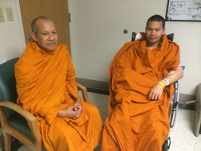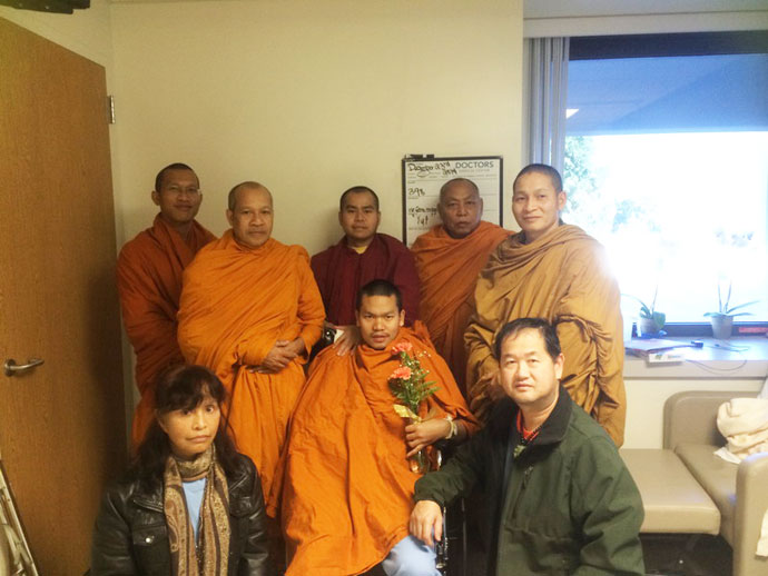 ข่าวเกือบจะเศร้าใจปลายปี 2557 สำหรับพุทธศาสนิกชน ชาวไทยนครซานฟรานซิสโก ช่วยเป็นขวัญกำลังใจ ให้พระมหายุทธศักดิ์ ธมฺมจารี พระสงฆ์ไทย เดินทางมาปฏิบัติธรรมศาสนกิจ ที่วัดสันติธรรม เมืองโคดรลาโดสปริง และได้ย้ายมาช่วยงานพระศาสนาที่วัดพระพุทธิวงศ์มุนี เมืองสต๊อกตัน และย้ายไปช่วยงานพระศาสนา ที่วัดเทพนิมิต เมืองโมเดสโต ได้เกิดป่วยกระทันหันไม่ทราบสาเหตุ ได้พระมหานราธิป อธิจิตโต พาเข้าส่งพยาบาลกระทันหัน ขณะนี้ในความดูแลของแพทย์และพยาบาล พยายามค้นหาสาเหตุจากโรคอะไร จนปัจจุบัน ยังหาเหตุไม่พบ คุณหมอ ไม่ได้นิ่งนอนใจ เฝ้าดูอาการอย่างใกล้ชิด ข่าวว่า แจ้ง ว่า ท่าน พระครูวิเทศพุทธิคุณ เจ้าอาวาสวัดพระพุทธิวงศ์มุนี ,พระครูวรสิทธิวิเทศ วัดพุทธประทีป ซานฟรานซิสโก พาคณะพระธรรมทูต เช่นพระมหานราธิป อธิจิตฺโต ,พระมหาพนม ภูริปญโญ,พระอาจารยประมวล ,พระอธิการบุญมา วรปญโญ และพระสงฆ์อีกส่วนได้เดินทางจากนครซานฟราน ไปเยี่ยมถึง โรงพยาบาล Doctor Medical Modesto เมื่อช่วงบ่ายวันที่ 20 ธันวาคม 2557 ที่ผ่านมา ทราบว่าได้พูดคุยสนทนากัน มีน้ำเสียงการพูดของท่านพระมหายุทธศักดิ์ ธมฺมจารี ไม่ชัดเจนผิดไปจากเสียงปกติ ขาทั้ง 2 ข้าง ไม่มีกำลังในการเดิน ต้องอาศัยไม้เท้าช่วย และมีบุรุษพยาบาลคอยช่วยอีกที ..พระมหายุทธศักดิ์ เป็นพระที่ขยันมาก ช่วยงานที่วัดตลอด ทั้งที่ยังอายุไม่มาก สามสิบกว่า แต่มาเกิดโรคเช่นนี้ และเกือบจะเอาชีวิตมาทิ้งที่อเมริกา ขณะที่พักรักษาตัวที่โรงพยาบาล มีเพื่อนพระรุ่นเดียวกัน ต้องบินด่วนมาจากโคโรราโดและเพื่อนพระที่มีวัดอยู่ในระแวกใกล้เคียง ช่วยดูแลใกล้ชิดเพราะไม่สามารถจจะช่วยตัวเองได้ ท้อแท้ใจ ในยามนี้ ท่านคงต้องการกำลังใจ กริ๊งกร๊างส่งใจไปบ้าง จะได้ช่วยท่านให้หายเร็ว ๆ วัน ทรัพย์สินเงินทอง ไม่สำคัญเท่าใจ......สอบถามที่ 209 221-2153