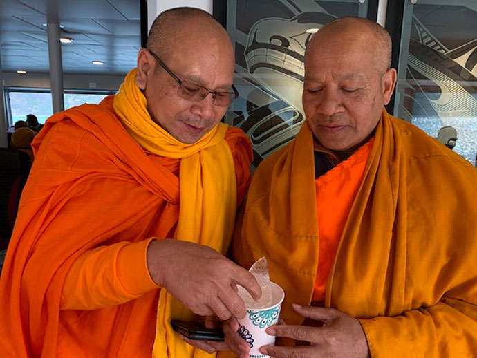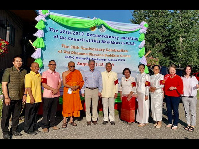 การเดินทางเที่ยวนี้เครื่องบินออกล่าช้าทำให้ต่อเครื่องบินไปยังเมืองแองเคอร์เรจ ล่าช้าจะไม่ทันเครื่องบินอาศัยประสบการณ์การเดินทางบ่อยทำให้คล่องตัว เดินอย่างรวดเร็วเกือบจะเป็นคนสุดท้ายของเครื่องบิน ขึ้นเครื่องสิบเอ็ดโมง ไปถึงสนามบินนานาชาติเมืองแองเคอร์เรจ บ่ายสองโมงครึ่ง ล้าไปครึ่งชั่วโมงได้แจ้งเจ้าหน้าที่ทางวัดเรียบร้อยแล้ว ลงจากเครื่องบินทำภารกิจส่วน ได้รับโทรจากหน้าที่ ให้ท่านเดินทางมาคอยที่ประตู 1 รถจะคอยที่นั่นระหว่างนั่งในรถเจ้าหน้าที่ขับรถได้ให้ข้อมูลของของรัฐอลาสก้าอย่างมาก ถือสุดยอด ประกอบอาชีพในเมืองแองเคอร์เรจ อลาสก้าเกือบ 50 คนเรียกว่ามวยถูกคู่ อย่างรู้เรื่องเมืองอลาสด้ามานาน เป็นรัฐสุดท้ายอเมริกา ได้รับเรื่องราวอย่างหน้าตื่นเต้น โดยเฉพาะเอสกิโม ชนเผ่าพื้นเมืองอลาสก้า ลูกเค้าเหล่าเมียใครเหมือนญาติกันทั้งหมดอยู่เป็นหมู่บ้านเล็ก ใครชอบใจใครก็ว่ากันไปตามวิถีชีวิตของคนมีวัฒนธรรมที่แตกต่างกันโดยไม่มีศีลธรรม นั่งคุยกันเพลินเจ้าหน้าที่ขับรถถึงวัดแล้วครับท่าน เจ้าหน้าของวัดคอยอยู่บริเวณนั้นเพื่อถวายการต้อนรับพระเถระ ซึ่งเดินทางมาจากสถานที่ต่างๆ ทั้งสี่ทิศช่วยยกกระเป๋าเปิดประตูรถถวายการต้อนรับน้ำร้อนน้ำชาดูแลพระเถระต่างเมืองแขกต่างบ้านด้วยความเต็มใจเข้าทำนองช้างเหยียบนา พญาเหยียบเมืองเพราะว่าผู้มาเยือนระดับผู้บริหารหรือเจ้าอาวาสระดับสมองของวัดใช่ว่าจะเดินทาง มากันง่ายๆ ภารกิจทุกท่านแน่น ความเป็นโชคดีของของชาวไทยที่อาศัยอยู่เมืองแองเคอเรจ อลาสก้า มีโอกาสได้ทำบุญพระจำนวนมากนับร้อยองค์ ที่เดินทางมาประชุมสมัยวิสามัญสมัชชาสงฆ์ไทยตามกำหนดการช่วงระหว่างวันที่ 17 -18 สิงหาคม 2562 หลังจากประชุมเสร็จกิจงานพระพุทธศาสนาจะได้ชมทัศนียภาพของเมืองอลาสก้าและเมืองต่างๆ อยู่ในบริเวณใกล้เคียง
