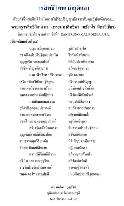 ฉบับนี้ขอนำ“ มุทิตาร้อยกรองสดุดี ” แสดงความยินดี ต่อท่าน พระครูวรสิทธิวิเทศ เจ้าอาวาสวัดพุทธประทีป ซานฟรานซิสโก ที่สำเร็จการศึกษาดุษฏีบัณฑิต ปริญญาเอกหรือที่เรียกภาษาทั่วไปว่า ดอกเตอร์ เป็นพระสงฆ์รูปเดียวรูปแรกเบย์แอเรียซานฟรานซิสโก ที่สำเร็จการศึกษาในระดับสูงสุดทางโลก จากคณะครุศาสตร์มหาวิทยาลัย มหาจุฬาลงกรณราชวิทยาลัย มหาวิทยาลัยสงฆ์แห่งคณะสงฆ์ไทย มจร.วังน้อย อยุธยา สาขาการสอนสังคมศึกษา เป็นของขวัญปีใหม่ 2568 แก่คณะลูกศิษย์ลูกหาที่นครซานฟรานและทั่วโลกต่างแสดงความยินดี ต่างดีใจกันทั่วหน้า วรสิทธิวิเทศาภิถุติกถา “ โดย ดร.นักร้อง บุญสังข์ เปรียญ 9 นักวิชาการอิสระ
