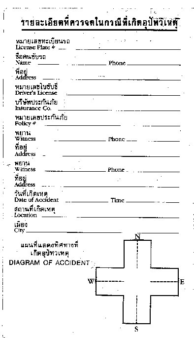 ถ้ากรณีเกิดอุบัติเหตุถ้าไม่มีผู้บาดเจ็บ สถานีตำรวจส่วนใหญ่จะไม่ส่งตำรวจมาทำรายงาน( Traffic Collision Report) เพราะไม่มีงบ และเวลา หน้าที่ของคุณก็เอาใบรายละเอียดที่ผมให้ขึ้นมาเขียนให้ละเอียด เขียนตามบรรทัดต่อบรรทัด เช่น หมายเลยทะเบียนรถ, ชื่อคนขับ ใบขับขี่ ใบอินชัวรันส์ วันเกิดเหตุ เวลา สถานที่ และที่สำคัญถ้ามีพยานให้จดชื่อที่อยู่โทรศัพท์เขาไว้ ทำแผนผังตำแหน่งของรถตามที่ผมได้แนบมาก็จะไม่หลงลืม ไม่ต้องตื่นตกใจคิดว่าเป็นเรื่องธรรมดา เราซื้ออินชัวรันส์ก็เพื่อช่วยชดใชัจ่ายค่าเสียหายใหัเราและคู่กรณี เปลี่ยนข้อมูลเอกสารกัน ห้ามพูดอะไรที่ไม่จำเป็นกับคู่กรณี ห้ามรับผิดหรือถูก ห้ามเซ็นชื่ออะไรนะครับ นอกจากถ้าตำรวจมา เขาจะถามว่าเกิดอะไรขึ้นก็พูดตามความจริง ถ้าตำรวจไม่ทำรายงาน (Traffic Collision Reports) ให้ ก็ควรจดชื่อเขาไว้ ส่วนใหญ่มีป้ายชื่ออยู่บนหน้าอก และเบอร์ประจำตัวของตำรวจซึ่งมีอยู่ทุกนาย เพราะเขาอาจจะเป็นพยานให้เราได้ในภายหลัง