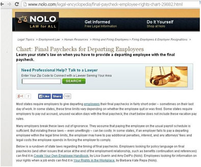 ซึ่งจะให้ข้อมูลอันเป็นปัจจุบันของแต่ละรัฐในสหรัฐอเมริกาในเรื่องของกฎเกณฑ์ในการให้เช็คใบสุดท้ายแก่พนักงานที่คุณเลิกว่าจ้าง หรือในกรณีที่พนักงานต้องการออกจากงานด้วยความสมัครใจ ลองเข้าไปอ่านกันได้ค่ะ