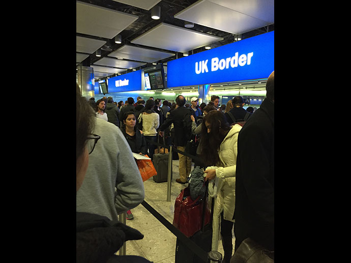 เออ..ตอนเข้าแถวผ่านอิมมิเกรชั่นอังกฤษนั้น เขาก็ยังใช้แบบอเมริกาหรือของไทย คือต้องมาให้อิมมิเกรชั่นดูหน้า ถามนิดหน่อย และเขามีป้ายแปลกว่า ห้ามพูดจาดูถูกดูแคลนเจ้าหน้าที่โดยเด็ดขาด (Notice of Abuse) เตีอนว่าจะถูกดำเนินคดี และมีโทษทั้งจำทั้งปรับ ก็ให้ชวนสงสัยว่า เจ้าหน้าที่คงโดนบ่อย ก็เลยติดป้ายเตือน ห้ามไว้ก่อน