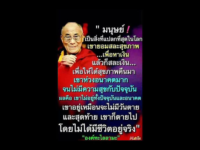 ขอกราบขอบพระคุณหลาย ๆ ท่าน ที่ได้ร่วมแสดงความเสียใจกับการจากไปของ อาม่า สุนีย์ ดีสมเลิศ หลังจากที่ได้อ่านบทความในคอลัมน์เมื่อสองสัปดาห์ก่อน ก็เลยอยากเตือนให้พวกเราดูแลสุขภาพให้ดี เพราะการเจ็บป่วย หรือการตาย เขาไม่เลือกว่าคุณเป็นคนแก่หรือหนุ่มสาว อายุเท่าไรไม่สำคัญเลย ถ้าคุณประมาทไม่รักษาตัว และจิตใจให้ดีแล้ว เมื่อนั้นโรคจะมาเยือน แล้วเวลามันมา มันจะมาเป็นแพ็คเกจ (Packages) โรคที่เป็นชุด ๆ เนื่องจากอวัยวะของร่างกายมันทำงานประสานกันหมด ดังที่ท่านเจ้าคุณพระเทพมงคลวิเทศ เจ้าอาวาสวัดไทย ลอสแองเจลิส เคยเทศน์ในงานบำเพ็ญกุศลศพบ่อย ๆ ว่า คนเราเลือกวันเกิดได้ แต่ไม่มีใครจะเลือก หรือรู้วันตายได้ จะมาถึงเราเมื่อไรก็ได้ ฉะนั้น สิ่งที่เราจะนำติดตัวไปกับเราได้ คือ คุณความดี กับบุญที่ได้สร้างสมมาเท่านั้นที่จะไปกับเราได้ บางท่านตั้งหน้าตั้งตา ทำแต่งาน ชีวิตมีแค่ที่ทำงานกับกลับบ้าน ดูทีวี ละครไทย ไม่เคยสนใจอะไรทั้งใกล้ หรือไกลตัวเองเลย สุดท้ายเจ็บป่วย เงินที่หามาได้ก็ต้องจ่ายให้หมอหมด สุดท้ายหาเงินมาให้คนอื่นใช้ ผมขออนุญาตนำการเทศน์ของท่าน ดาไล ลามะ (Dalai Lama) องค์ที่ 14 ผู้ได้รับรางวัลโนเบล สาขาสันติภาพ ในปี พ.ศ. 2532 (ค.ศ. 1989) ท่านถือเป็นประมุขแห่งพุทธศาสนานิกายมหายาน แห่งทิเบต ปัจจุบันอายุ 80 ปี ซึ่งเทศน์ได้ตรงประเด็นจริง ๆ