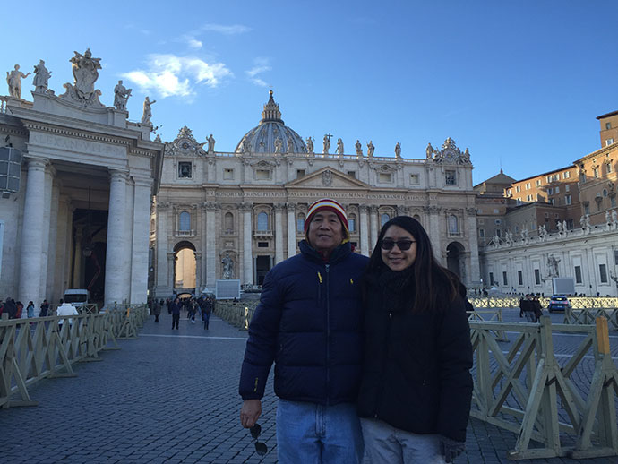 วันต่อไปเราต้องไปนครรัฐวาติกัน พระราชวังพระสันตะปาปา (Palace of the Vatican) นั่งรถบัสที่ขึ้นลงได้ทุกที่ในกรุงโรม เรียกว่า Hop on – Hop off ราคา 20 ยูโร ใช้ได้ทั้งวัน รถบัสแบบนี้มีเกือบทุกเมืองในยุโรป สะดวกสบาย มีหูฟังคำบรรยายขณะนั่งก่อนถึงจุดหมายของเรา พอมาถึงที่ประทับของโป๊ป มุขนายกแห่งคริสตจักรกรุงโรม (Bishop of the Church of Rome) ซึ่งเป็นผู้นำคริสตจักรโรมันคาทอลิกทั่วโลก ปัจจุบันดำรงตำแหน่งประมุขโดย สมเด็จพระสันตะปาปา ฟรานซิส องค์ที่ 16 อายุ 79 ปี ขึ้นดำรงตำแหน่งนี้ในปี 2556 น่าเสียดายพอไปถึงสัก 8 โมงเช้า ยามบอกว่าท่านโป๊ป ฟรานซิส กำลังบรรทมอยู่ (หลับ) มิฉะนั้นคงได้เข้าเฝ้า