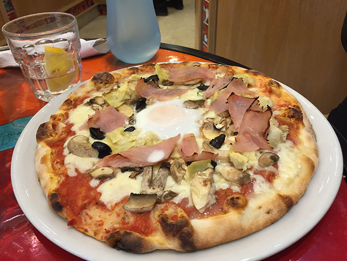 พอพักเสร็จสรรพ ก็เดินเลย ที่แรกที่จอดคือ ร้านพิซซ่า ถ้ามาอิตาลีไม่ทานพิซซ่าก็แสดงว่ายังมาไม่ถึง เพราะที่นี่เป็นถิ่นเกิดของพิซซ่า เขาขายโดยการชั่งน้ำหนัก คือถ้าเราไม่แน่ใจเพราะมันมีหลายสิบแบบให้เลือก ทานสัก 4 ชิ้น ราคาก็ไม่แพง ประมาณ 6 ยูโร (ควรแลกเงินยูโรไปก่อน มิฉะนั้นจะโดนค่าคอมมิชชั่นและราคาก็ไม่ดีเท่าที่แลกจากอเมริกา) 1 ยูโร เท่ากับ 1.08 ดอลล่าร์ คิดง่าย ๆ ก็คิดว่ามันเท่ากับเหรียญอเมริกันก็พอ