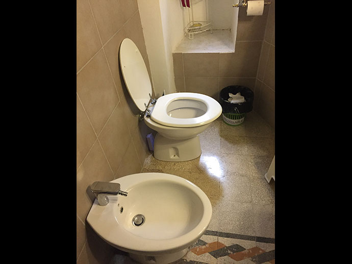 ลูกสาวติดต่อคนที่เราเช่าบ้านเขาอยู่ให้เตรียมคนมารับที่สนามบินลีโอนาโด ดาวินชี่ กรุงโรมเลย ขับรถพาเข้ามาถึงที่พัก ก็มีความรู้สึกว่า บ้านเขาโอ่โถงมาก ดูจากเพดานที่สูง ๆ มีครัวให้ใช้เสร็จสรรพ พักสัก 2-3 ชั่วโมง เข้าห้องน้ำ มีโถส้วม 2 โถ ดูแปลกดี อีกอันหนึ่งไว้ล้างก้น มีราวตากเสื้อให้อุ่นเหมือนที่อังกฤษ พออาบน้ำเสร็จ พักสักหน่อยก็เริ่มลุยเดินเท้ากันเลย เพราะเขาบอกว่า สถานที่เช่าอยู่นี้ ใกล้สถานที่ท่องเที่ยว ทุกอย่างเดินถึงกันได้หมด
