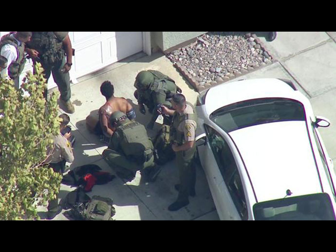 ในขณะที่เจ้าวายร้ายได้พยายามจะขับรถ SUV ของซาเจ้นท์เพื่อหลบหนี แต่ถูกตำรวจเชอริฟที่มาเสริมกันเป็นจำนวนมากสกัดไว้ มีการยิงต่อสู้กัน จนผู้ร้ายต้องรีบออกจากรถ ปีนกำแพงหนีเชอริฟอย่างสุดชีวิต และวิ่งเข้าบ้านอีกหลังหนึ่ง ซึ่งมีเด็กวัยรุ่นอยู่ในบ้าน 2 คนได้เท็กซ์แจ้งกับทางสถานีตำรวจว่าคนร้ายกำลังหลบอยู่ในบ้านของเขา ตอนนี้ได้มีกำลังตำรวจเสริมจาก S.W.A.T. ทีม (Special Enforcement Bureau “S.E.B.”) ซึ่งเป็นหน่วยเฉพาะกิจที่มีความชำนาญพิเศษในการจู่โจม พร้อมด้วยกำลังเฮลิคอปเตอร์ก็มาเสริม จนสามารถนำผู้ต้องหาออกมาจากบ้านที่หลบอยู่แต่โดยดี โดยเขามีบาดแผลจากการต่อสู้ บริเวณลำตัวและแขน ถูกนำส่งโรงพยาบาล