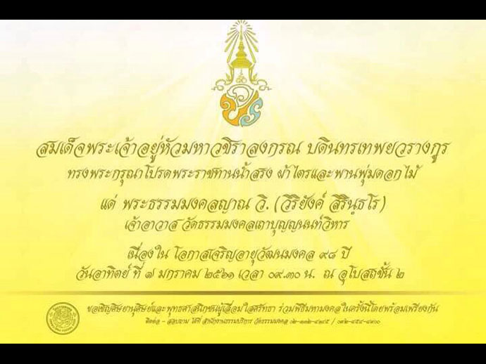 สมเด็จพระเจ้าอยู่หัวมหาวชิราลงกรณ บดินทรเทพยวรางกูร รัชกาลที่ 10 ทรงพระกรุณาโปรดพระราชทานน้ำสรง ผ้าไตร และพานพุ่มดอกไม้ แด่ พระธรรมมงคลญาณ เนื่องในพิธีมหามงคลนี้ ในวันที่ 7 มกราคม พ.ศ. 2561 เวลา 09.30 น. ณ อุโบสถชั้น 2 วัดธรรมมงคล