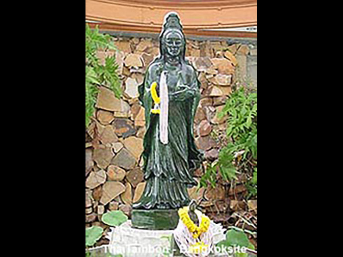 และจากหยกก้อนเดียวกัน ก็ได้แกะสลักเป็นองค์เจ้าแม่กวนอิม ปางยืนประทานพร ขนาดสูง 2.20 เมตร ใช้เวลาแกะสลัก 9 เดือน ประดิษฐาน ณ ศาลา ภปร. ถือเป็นประติมากรรมอันล้ำค่าน่าอัศจรรย์จากหยกเนื้อดีมาก สีเขียวงดงาม และแข็งแรงมาก