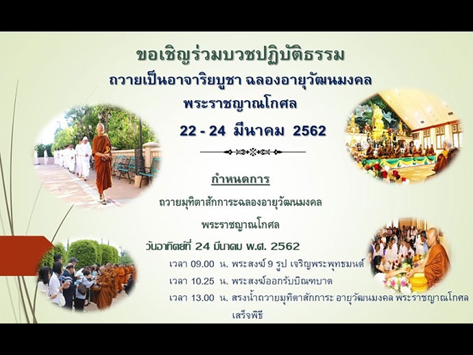 ในการฉลองอายุวัฒนมงคลในปีนี้ ก็จะมีการร่วมบวชปฏิบัติธรรม เพื่อถวายเป็นอาจาริยบูชา ในวันที่ 22 -24 มีนาคมนี้ ซึ่งในวันอาทิตย์ที่ 24 มีนาคม จะมีพิธีถวายมุทิตาสักการะ เริ่มด้วยพระสงฆ์ 9 รูป เจริญพระพุทธมนต์ในเวลา 9.00 น. พระสงฆ์ออกรับบิณฑบาตเวลา 10.25 น. และ จะสรงน้ำถวายมุทิตาสักการะ อายุวัฒนมงคล พระราชญาณโกศลในเวลา 13.00 น. จึงขออนุญาตบอกบุญให้ท่านทั้งหลายมาทำบุญร่วมกันในวันและเวลาดังกล่าวโดยพร้อมเพียงกันด้วย