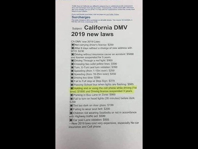 ล่าสุด ก็กรณีมีคนแชร์กันว่า มีกฎหมายจราจรใหม่ในแคลิฟอร์เนีย California DMV 2019 New Laws บอกว่า Holding and or using the cell phone while driving (1st time): $1000 and driving license suspended 3 years ถ้าผู้ขับขี่รถถูกจับในขณะใช้โทรศัพท์มือถือ จะถูกปรับ $1,000 (ครั้งแรก) และยึดใบขับขี่ 3 ปี