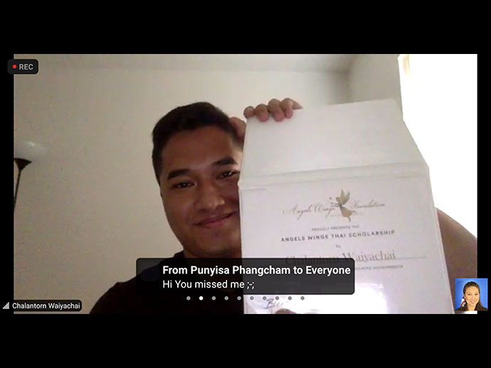 เมื่อวันที่ 15 สิงหาคม 2563 นายมังกร ประทุมแก้ว กงสุลใหญ่ ณ นครลอสแอนเจลิส ได้ร่วมพิธีมอบทุนการศึกษาของมูลนิธิ Angels Wings แก่เยาวชนเชื้อสายไทยในสหรัฐฯ ประจำปี 2563 พร้อมกับนางภรณ์ทิพย์ นาคหิรัญกนก ไซมอน ผู้ก่อตั้งและประธานมูลนิธิฯ ผ่านทางแอพพลิเคชันการประชุมออนไลน์ Zoom