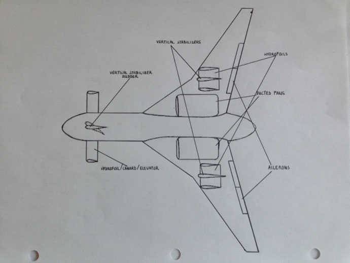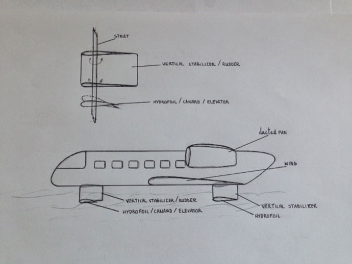 4) ใช้การออกแบบของเรือบิน ซึ่งไม่มีทุ่นใต้ลำตัว ทำให้น้ำหนักและแรงต้านน้อยลง อย่างไรก็ดี ควรจะเปลี่ยนจากรูปร่างอุ้ยอ้ายด้านล่างของเรือบินให้เป็นแบบเรียบเพรียวลมของเครื่องบินทั่วไป จะกำจัดแรงต้านลงไป เป็นผลให้มีประสิทธิภาพสูงขึ้น ส่วนในการช่วยให้เรือบินขับเคลื่อนบนผิวน้ำได้คล่อง เราสามารถรวมใช้เทคโนโลยี Hydrofoil เพื่อช่วยยกเรือบิน (ทั้งลำ) ให้ลอยและวิ่งอยู่เหนือน้ำ