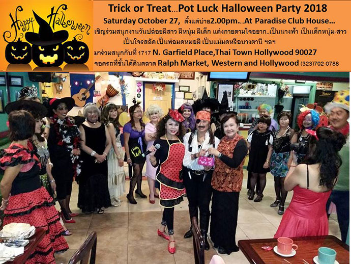 หลายๆองค์กรณ์ ชมรมต่างพากันจัดงานแต่งตัวแฟนซีรื่นเริงกันเมื่อสุดสัปดาห์ก่อนวันพุธที่ตรงกับวันธรรมดาและไม่ได้เป็นวันหยุด ซึ่งพวกเราสมาชิกของสโมสรรักสุขภาพเพิ่งจัดงาน Happy Halloween Pot Luck Party ขึ้นเมื่อวันเสาร์ที่ 27 ตุลาคมที่ผ่านไปที่ Paradise Club House Thai Town Hollywood มีสมาชิกมาร่วมฉลองด้วย ประมาณ 50 กว่าคน สนุกสนานด้วยการแต่งตัวแฟนซีมาอวดโฉมกัน ร้องเพลง เต้นรำ เม๊าท์มอย ร้องเพลงวันเกิดให้กับผู้เกิดเดือนตุลาคมที่มาร่วมในงาน