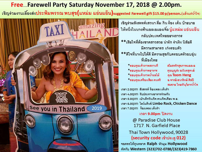 เมื่อเร็วๆนี้สโสรรักสุขภาพได้จัดงานเลี้ยงส่งสมาชิกแฟนคลับคนหนึ่งที่อยู่ในอเมริกามานานทำตัวเป็นประโยชน์กับชุมชนไทยในลอสแอนเจลิสมาตลอดได้ตัดสินใจย้ายถิ่นฐานที่พำนักกลับเมืองไทยถิ่นเกิดอย่างถาวร เราได้จัดงานเลี้ยงส่งให้เธอไปเมื่อวันที่ 17 พฤศจิกายนที่ผ่านมามีเพื่อนๆที่รักไปร่วมงานกันเกือบ 50 คน