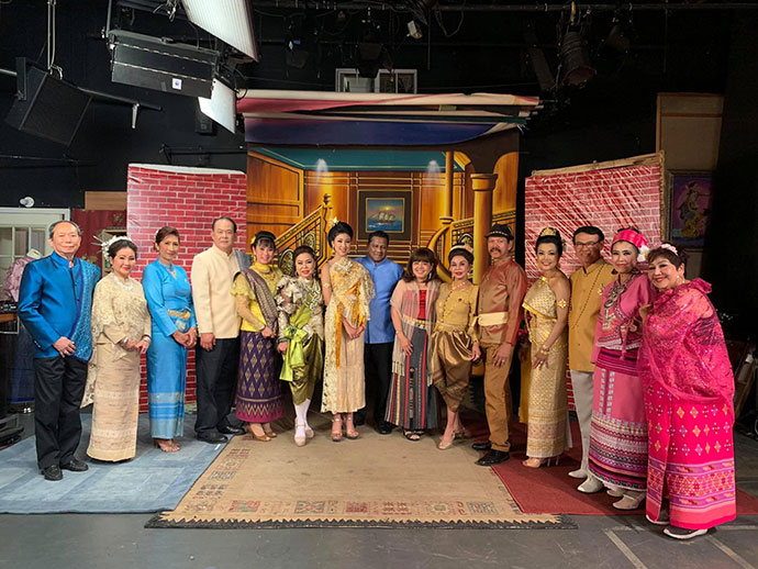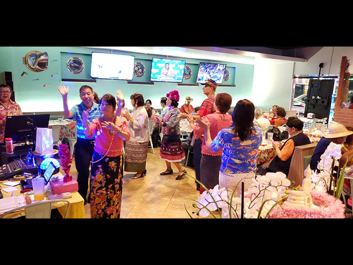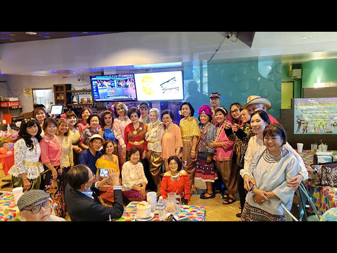 ห้องอาหารตำหนักไทยในไทยทาวน์ฮอลลีวูดที่ดิฉันมอบความบันเทิงให้ทุกวันเสารก็ได้จัดฉลองปีใหม่ไทยเมื่อค่ำคืนวันเสาร์ที่ 13 เมษายน เช่นกัน มีแฟนคลับแต่งชุดไทยสวยงามหลากหลายสมัยทั้งหญิงและชายมาสรงน้ำพระ มีการรำกลองยาว มีการเล่นรำวง ร้องเพลงเต้นรำ อีกทั้งยังฉลองวันเกิดผู้หมวดเคน ไคนท์กันอย่างคึกคัก พกพาความสุขกลับบ้านกันเป็นแถว ทำเอาลูกค้าฝรั่งต่างชาติ ตื่นเต้น ครึกครื้นสนุกสนานมาร่วมฉลองสงกรานต์กับพวกเราไปด้วย เป็นที่น่ายินดียิ่งนัก