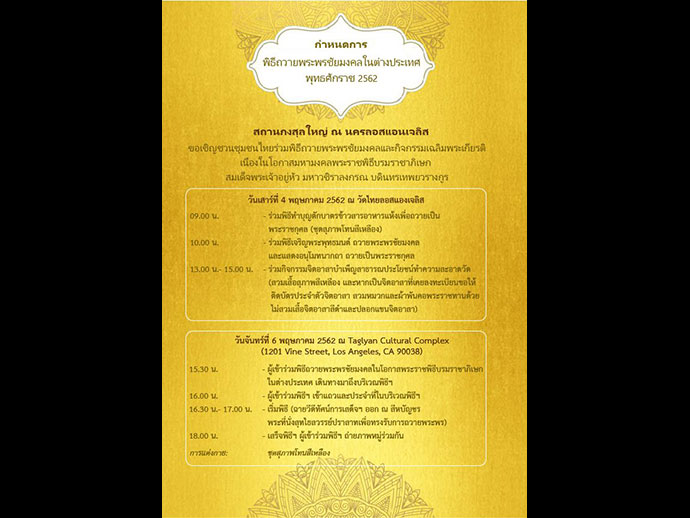 สถานกงสุลใหญ่ฯมีกำหนดจะจัดกิจกรรมเพื่อเปิดโอกาสให้ชุมชนไทยทุกหมู่เหล่าที่อาศัยอยู่ในเขตอาณาของสถานกงสุลใหญ่ได้ร่วมพิธี