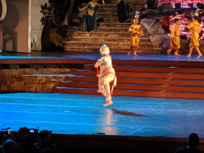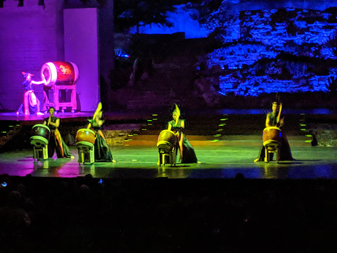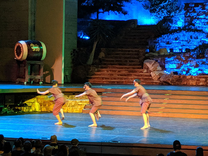 ระหว่างการเล่าเรื่องมีการสอดแทรกดนตรีที่มีความสนุกเร้าใจ โดยนำเอากลองใหญ่ของญี่ปุ่น กลองสะบัดชัยของไทย และกลองชุดมาแสดงผสมผสานกันด้วยการประพันธ์เพลงและออกแบบการแสดงขึ้นมาใหม่ มีการนำเอาเรื่องราวพื้นบ้านของไทยและสัตว์ในเทพนิยาย อาทิเช่น พญานาค ม้า กินนรี นกยูง ผีเสื้อและสัตว์อื่นซึ่งอยู่ในป่าหิมพานต์ รวมทั้งนำตัวละครจากโขนรามเกียรติ์ อาทิ หนุมาน มาเต้นโขนเพื่อโชว์ศิลปะไทยขั้นสูงด้วย
