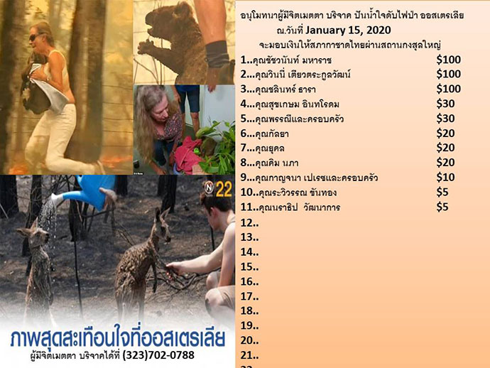 ผู้ใดสะดวกขอเชิญพบกันในงานการกุศลซับน้ำตาช่วยดับไฟป่าออสเตรเลีย Tea Dance on Saturday January 18, 2020 ที่ห้องอาหารตำหนักไทย ในไทยทาวน์ฮอลลีวูด เวลา บ่ายโมง – หนึ่งทุ่ม หรือโทรศัพท์เข้ามาบริจาคได้ที่ (323)702-0788 เราจะรวบรวมเงินบริจาคเข้าสภากาชาดไทยผ่านสถานกงสุลใหญ่ วันเวลาจะแจ้งให้ทราบอีกที