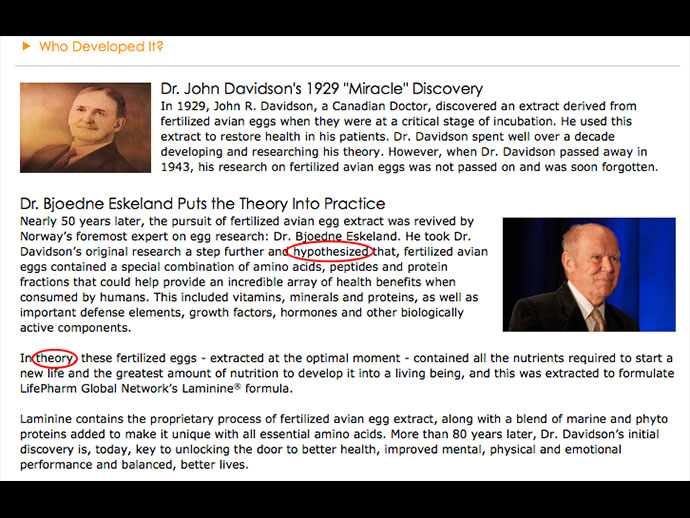Dr. John Davidson นายแพทย์ชาวแคนาดาได้ค้นพบสารสกัดสำคัญจากเซลล์ต้นกำเนิด (Stem Cell) ในไข่ไก่ที่ได้รับการเพาะเชื้อแล้วนี้ ได้เป็นครั้งแรกในปี ค.ศ. 1929 เพื่อใช้ในการรักษาผู้ป่วยโรคมะเร็ง เป็นที่น่าเสียดายเป็นอย่างยิ่งที่ก่อนที่ผลงานวิจัยชิ้นนี้ จะได้รับการประกาศ รับรองอย่างเป็นทางการ Dr. John Davidson ได้เสียชีวิตลงก่อน ในปี ค.ศ. 1948 เวลาผ่านไปเกือบ 5 ทศวรรษ Dr. Bjodne Eskeland นายแพทย์ชาวนอรเวย์ ได้ค้นพบสารสกัดนี้อีกครั้งแล้วนำไปวิเคราะห์ ซึ่งพบว่ามีคุณสมบัติดีเป็นไปตามที่เคยบันทึกไว้ ด้วยการนำไปพิสูจน์ กับผู้ป่วยในสถานพยาบาลจริงหรือที่เรียกว่า Clinical Study