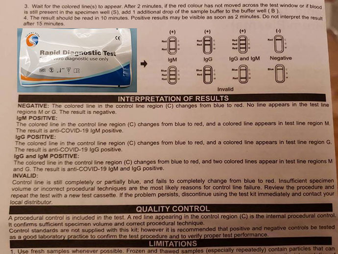 หลักการตรวจ Covid Antibody 19 นั้นนายแพทย์จะทำการเจาะเลือดจากปลายนิ้วมือ และนำไปหยดลงบนเครื่องตรวจ ซึ่งรายงานผลภายใน 5-10 นาที่ รับประกันความถูกต้องถึง 95% รับรองโดย FDA ทางนายแพทย์จะมีเอกสารรับรองผลตรวจที่แยกออกมา 4 ชนิด คือ