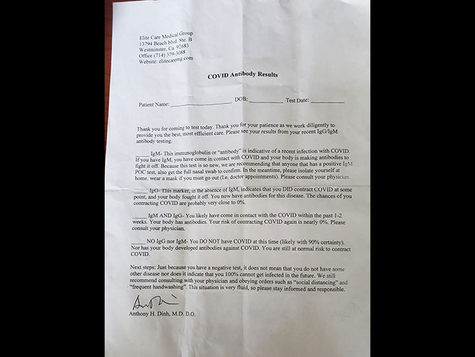 ปกติ ตามบริษัทต่างๆที่มีการตรวจด้วย Serology Antibody Covid 19 Test Kits นี้ได้ประกาศและลงโฆษณาว่ามีค่าใช้จ่าย $95 ต่อหนึ่งชุด ซึ่งทาง อีลีทแคร์เมดิคอลกรุ๊ปเสนอให้กับชุมชนไทยฟรีสำหรับผู้ที่มีประกันสุขภาพ และ$30 สำหรับผู้ไม่มีประกันฯ แต่เป็นความโชคดีของชุมชนไทย ที่ทางทีมแพทย์ของอีลีทแคร์กรุ๊ปได้รับเงินบริจาคมาจากองค์กรณ์การกุศลจากนายแพทย์ดีนห์ เพื่อมาจ่ายค่าตรวจให้กับผู้ไม่มีประกัน สรุปการตรวจครั้งนี้ให้กับชาวไทย 300 คนจึงไม่มีค่าใช้จ่ายใดๆทั้งสิ้น