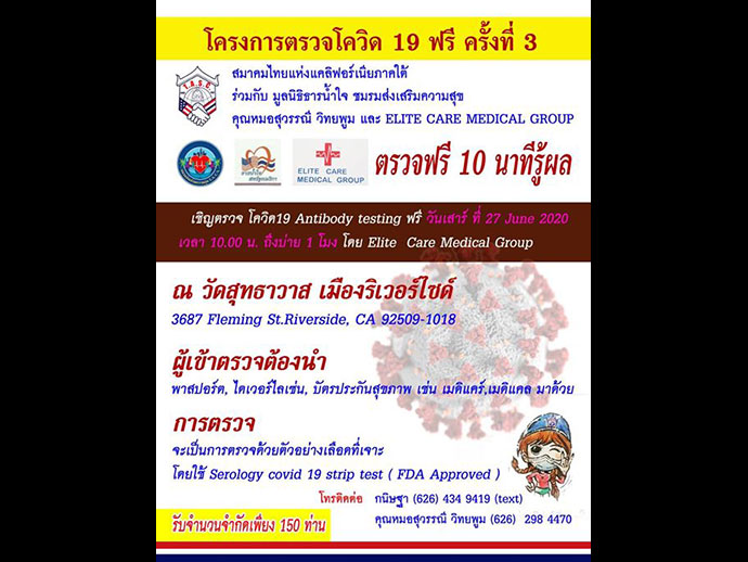 นอกเหนือจากนั้น ยังมีอีกโครงการที่เป็นของชาวต่างชาติมีน้ำใจมีความตั้งใจที่จะนำความรู้ทางด้านการแพทย์มาช่วยคลายความกังวลเรื่องการแพร่เชื้อโรคร้าย จากทีมงานนายแพทย์ Elite Care Medical Group นำโดย Dr. Anthony Dinh, MD. และ Monte Christen, COO. มีน้ำใจนำเครื่องตรวจหาไวรัส และภูมิต้านทานโรคระบาดโควิด 19 Serology Anti Body Covid 19 Testอันทันสมัยมาตรวจให้ชุมชนไทย ฟรี..ฟรี..โดยคิดมูลค่าใดๆทั้งสิ้น แถมบริจาคอาหาร น้ำดื่ม อีกต่างหาก ช่วงแรกก็มีเสียงวิพากษ์วิจารณ์ในเชิงลบ คิดว่าทีมงานนายแพทย์จะมาหวังผลประโยชน์ในกลุ่มคนไทย ด้วยความที่ไม่เข้าใจว่ายังมีคนมีน้ำใจอยากนำวิชาชีพความรู้มาช่วยโดยไม่หวังสิ่งตอบแทน อีกทั้งยังหาทุนจากองค์กรณ์การกุศลมาช่วยค่าใช้จ่ายอีกด้วย จนได้บริการ 3 ครั้งผ่านไป ความคิดในเชิงลบก็จางไป เพราะเห็นได้จากการกระทำที่มาจากความมีน้ำใสใจจริง ในการอุทิศตน สละเวลาของทีมงานนายแพทย์ซึ่งจะมีขึ้นอีกครั้งที่ วัดสุทธาวาสในวันเสาร์ที่ 27 มิถุนายน 2020 ตั้งแต่เวลา 10 โมงเช้าเป้นต้นไป