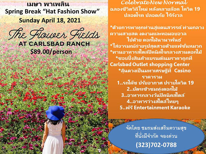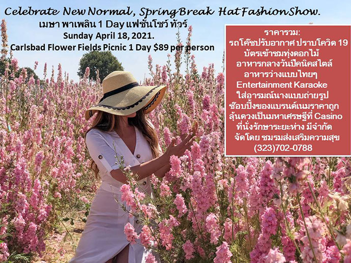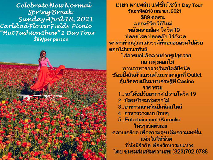 ทัวร์นี้เป็น วันเดียวทัวร์ “Hat Fashion Show Off” เน้นถ่ายรูปกับทุ่งดอกไม้แสนสวย พร้อมหมวกหลากหลายสไตล์ ต้อนรับฤดูใบไม้ผลิ ราคา $89.00รวมรถโค๊ชปรับอากาศรับส่ง บัตรเข้าชมทุ่งดอกไม้ อาหารกลางวันปิดนิคสไตล์ อาหารว่าง พาชมทุ่งดอกไม้ แวะชอบปิ้งที่ Premium Outlet แวะลุ้นเสี่ยงดวงเป็นเศรษฐีที่ Casino และมีการบันเทิงตลอดรายการอย่างถูกสุขลักษณะขององค์กรณ์สาธารณะสุขป้องกันโควิด CDC ด้วยการวัดอุณหภูมิ ล้างเจล ใส่หน้ากาก รักษาระยะห่าง จำนวนที่นั่งบนรถโค๊ช 50 ที่นั่ง เหลือเพียง 25 ที่นั่งเท่านั้น ตอนนี้ รถโค๊ชเต็มไปหนึ่งคันแล้ว กำลังเปิดรับคันที่สองจองที่นั่งได้ที่ (323)702-0788