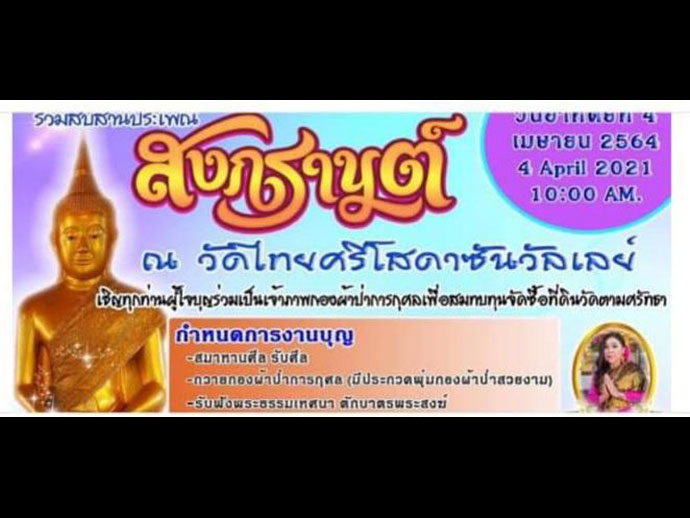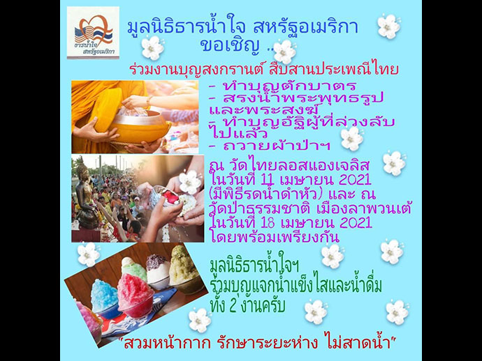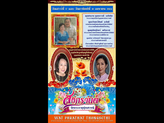 เดือนเมษายนทั้งเดือนจะมีการเฉลิมฉลองสงกรานต์ตามพิธีทางศาสนาที่วัดไทยต่างๆทั่วอเมริกา มีการรดน้ำดำหัวให้ผู้ใหญ่ที่เคารพแสดงกตัญญูกตเวทีเพื่อเป็นสิริมงคลแก่ตัวเองและครอบครัว ในการต้อนรับปีใหม่ 2564 ที่จะต้องดีกว่าปี 2563 อย่างแน่นอน เมื่อปี 2563โลกทั้งโลกต้องปิดตัวเองให้ห่างจากการแพร่ระบาดโรคร้าย โควิด 19 มีผู้คนเจ็บป่วยล้มหายตายจากกันเป็นล้านๆคนทั่วโลก ปีนี้จะต้องเป็นปีที่เปิดสู่ความสุขสนุกสนาน ร่าเริงเบิกบาน กลับคืนความมีชีวิตชีวาอีกครั้งหนึ่งอย่างแน่นอน