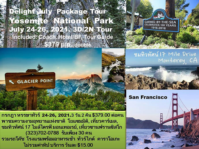 วันนี้เรามาคุยกันถึงเรื่องสบายๆ สนุกๆ จิตใจเบิกบานแจ่มใสด้วย เรื่องพากันไปเที่ยวดีกว่า ทุกครั้งที่พูดถึงเรื่องไปเที่ยว จะมีความรู้สึกฟู้ฟ่า มีพลังขึ้นมาทันที คุณๆ เป็นกันบ้างไมคะ ถ้างั้น วันเสาร์ที่ 24 – วันจันทร์ที่ 26 July เราจะพาคุณๆไป Mini Vacation กัน 3 วันพาเที่ยว อุทยานแห่งชาติ Yosemite, เมือง Monterey, Carmel Beach, 17 Miles Scenic Drive และเมือง San Francisco.