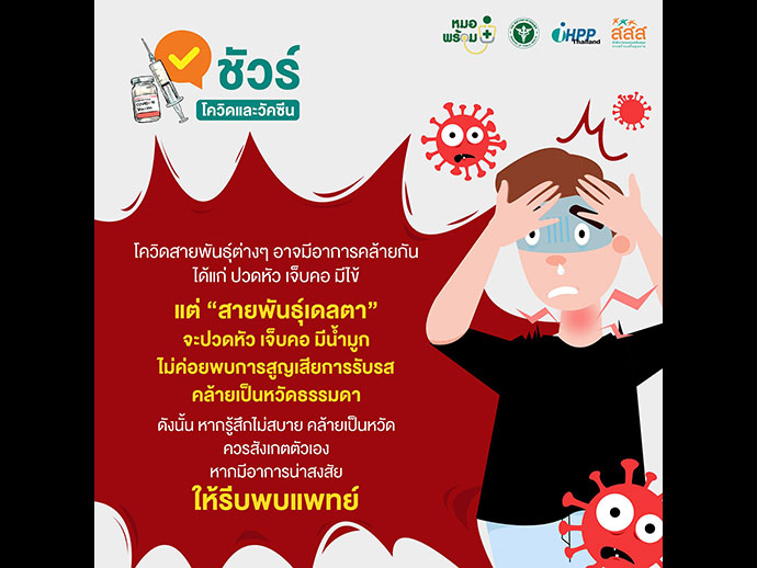 เช็กอาการ 'โควิดสายพันธุ์เดลต้า' คล้ายเป็นหวัด ปวดหัว-เจ็บคอ-มีน้ำมูกผู้เชี่ยวชาญด้านการวิจัยค้นคว้า ชี้แจงว่า เชื้อโควิดสายพันธุ์ต่างๆ อาจแสดงอาการป่วยคล้ายกัน เพียงแต่อาการเด่นที่ผู้ป่วยจะแสดงออกมาอาจต่างกัน อย่าง โควิดสายพันธุ์เดลต้า (เจอครั้งแรกที่ประเทศอินเดีย) ผู้รับเชื้อจะมีอาการคล้ายเป็นหวัด คือ ปวดหัว เจ็บคอ มีน้ำมูก แต่ไม่สูญเสียการรับรสที่มักเกิดขึ้นกับโควิดสายพันธุ์เดิม