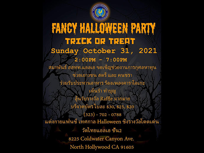 เนื่องจาก เดือนพฤศจิกายน ของปี 2021 กำลังจะมาถึงในอีกไม่กี่วันข้างหน้าแล้ว โดยวันอาทิตย์ที่ 31 ตุลาคม 2021 ซึ่งตรงกับเทศกาล ฮัลโลวีน มีงานการกุศลรื่นเริง Fancy Halloween Party ขึ้นที่ชั้น สองของโรงเรียนวัดไทยแอลเอเวลา บ่ายสองโมง ถึง หนึ่งทุ่ม เพื่อรวบรวมเงินไปซื้ออุปกรณ์การเรียน ออนไลน์ให้เยาวชนด้อยโอกาส ในงานแต่งกายแฟนซีตามเทศกาลฮอลลาวีน มีรางวัลคนแต่งกายโดดเด่นเตะตากรรมการ มีการจับฉลากของรางวัลมากมาย จากผู้ใจบุญ เช่น ทีวี 48 นิ้ว สปอนเซอร์โดย คุณแน็ท บุญนรากร ประธาน Hollywood LA Motor และผู้ใจบุญมากมาย มีทานอาหารบุ๊ฟเฟ่ ร้องเล่น เต้นรำทำบุญ บรรยากาสเริ่ด สนุกๆ ฉลองการถูกกักตัวช่วยชาติไม่ให้มีการระบาดของโรคโควิดเป็นปีๆ เข้าร่วมงานด้วยดารทำบุญ $20 ได้ รัฟเฟิ่ล จับรางวัล 1 ใบ $25 ได้รัฟเฟิ่ล 2 ใบ $30 ได้รัฟเฟิ่ลรับรางวัล 3 ใบ ขอเชิญทุกท่านร่วมงานการกุศลที่ให้ความอิ่มอก อิ่มใจ อิ่มบุญ สนุกสนาน กันด้วยนะคะ