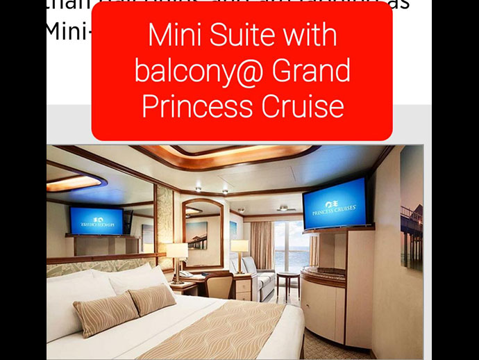 เราพักที่ห้อง Mini Suite with Balcony ห้อง D 706 ชั้น 9 อยู่ใกล้ลิฟต์ทางท้ายเรือสะดวกกับการขึ้นลงหากลิฟต์ลงมาจะตรงกับห้องอาหารและโรงภาพยนตร์ ขนาดของห้อง 323 sq.ft. มีระเบียง ให้ออกไปนั่งเล่นชมวิว สูดอากาศบริสุทธิ์ เราได้รับการต้อนรับอย่างอบอุ่นด้วยแชมเปญจน์จากทางเรือสำราญ Princess ที่แช่ไว้ในตู้เย็นเตรียมไว้ต้อนรับลูกค้า วีไอพี