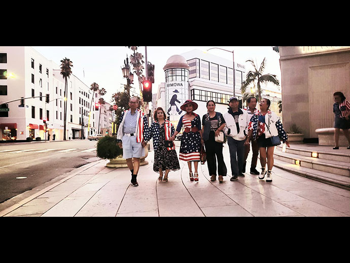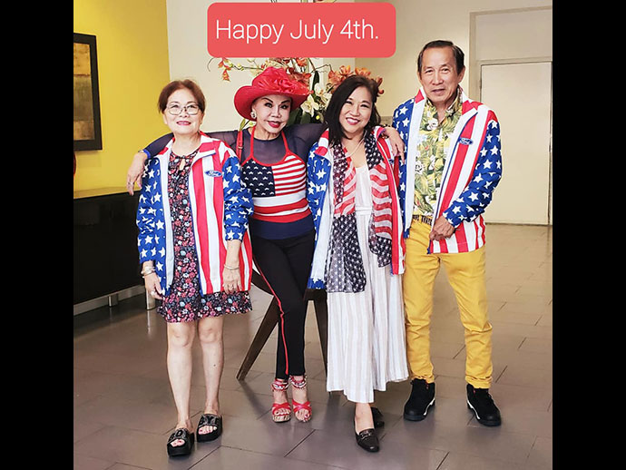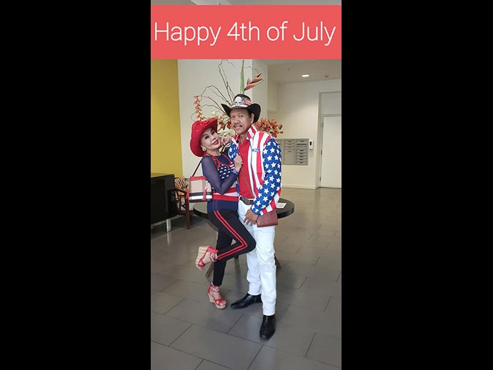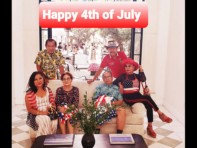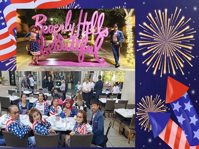 เราเป็นครอบครัวหนึ่งที่มีความภูมิใจกับการได้เป็นพลเมืองอเมริกัน เราจะมีปาร์ตี้กันทุกๆปี แตกต่างกันไป ปีนี้กลุ่มเรา 10 พากันไปฉลองที่ร้านอาหาร 208 Rodeo Restaurant, Beverly Hills ด้วยการแต่งชุดรักชาติ Patriot ธงชาติอเมริกัน เดินท่องราตรี ถ่ายรูปที่เมืองเบเวอร์ลี่ฮิลส์ ไปชมความอลังการณ์ของดอกไม้ไฟ เพื่อยกย่องให้เกียรติประเทศของเรา ฝากรูปแห่งความสุขมาให้มีความสุขไปกับพวกเราด้วย