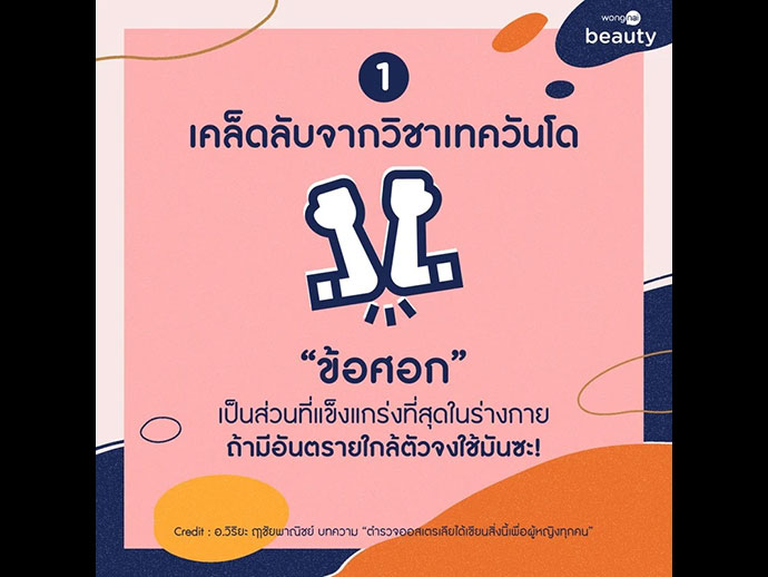 1. เคล็ดลับจากวิชาเทควันโด โปรดจงจำไว้ว่า "ข้อศอก" เป็นส่วนที่แข็งแกร่งที่สุดในร่างกาย ถ้ามีอันตรายมาใกล้ตัวเมื่อไหร่ จงใช้มันหยุดคนร้ายซะ! แล้วรีบวิ่งหนีให้เร็วที่สุด อันนี้เป็นวิธีป้องกันตัวเองเบื้องต้น ทุกคนสามารถทำได้ ไม่จำเป็นว่าต้องเป็นคนที่เคยฝึกเทควันโด มวยไทย หรือศิลปะป้องกันตัวอื่น ๆ เลย เชื่อเราว่า นาทีคับขันแบบนั้นให้พยายามใช้ข้อศอกป้องกันตัวเองให้มากที่สุด โดยจุดอ่อนสำคัญเราจะมาเรียนรู้กันต่อในข้อถัด ๆ ไปค่า