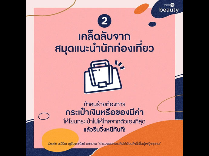 2. เคล็ดลับจากสมุดแนะนำนักท่องเที่ยว เคยเห็นข่าวฉุดวิ่งราวทรัพย์กันบ่อย ๆ ใช่ไหมล่ะคะ ลองคิดว่าสมมติถ้าเกิดขึ้นกับตัวเรา ถ้าคนร้ายต้องการกระเป๋าเงินหรือของมีค่า ขออย่างแรกเลยคืออย่าตกใจ ตั้งสติให้ดี แล้วให้พยายามโยนกระเป๋าหรือสิ่งของที่โดนขู่กรรโชกออกไปให้ไกลจากตัวเองที่สุด แล้วรีบวิ่งหนีไปอีกทิศทางนึงทันที แล้วรีบขอความช่วยเหลือให้เร็วที่สุด อย่างเดียวที่ขอเลยคืออย่าไปฉุดรั้งของมีค่ากับคนร้าย เพราะส่วนใหญ่คนร้ายที่กระทำการอุกอาจกล้าชิงทรัพย์ในที่สาธารณะแบบนี้ มักจะพกอาวุธ และตั้งใจจะทำร้ายเจ้าของทรัพย์อยู่แล้ว ฉะนั้นไม่เสี่ยงดีที่สุดค่ะ!