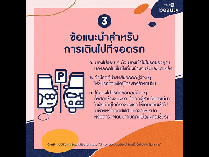 3. ข้อแนะนำสำหรับการเดินไปที่รถที่จอดอยู่ในลาน / โรงจอดรถ อันดับแรกให้มองไปรอบ ๆ ตัว พยายามมองเข้าไปในรถของเพื่อน ๆ เอง มองลอดไปจนถึงบนพื้นฝั่งที่นั่งข้างคนขับและเบาะหลังด้วยนะคะ ถ้าข้าง ๆ รถมีรถตู้ หรือรถน่าสงสัยจอดอยู่ข้าง ๆ ให้ขึ้นรถทางฝั่งผู้โดยสารข้างคนขับแทน ให้มองไปที่รถที่จอดอยู่ข้าง ๆ ทั้งสองฝั่งของรถเรา ถ้าเจอผู้ชายหรือคนที่น่าสงสัยนั่งอยู่คนเดียวในฝั่งที่อยู่ใกล้รถของเรา ไม่ต้องคิดอะไรมากเลย แต่ให้เดินกลับเข้าไปในห้างหรือออฟฟิศทันที เพื่อขอให้พี่ยาม รปภ. หรือตำรวจเดินมากับเราเพื่อส่งเราขึ้นรถ