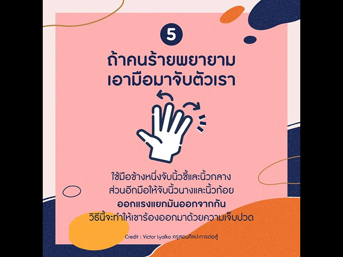 5. ถ้าคนร้ายพยายามเอามือมาจับตัวเรา... ถ้าคนร้ายพยายามยื่นมือมาจับเรา ให้เราคว้ามือคนร้าย แล้วใช้มือข้างหนึ่งจับที่นิ้วชี้และนิ้วกลาง ส่วนอีกมือให้จับนิ้วนางและนิ้วก้อย ออกแรงแยกมันออกจากกันให้สุดแรง วิธีนี้จะทำให้เขาร้องออกมาด้วยความเจ็บปวดและหยุดชะงัก ทำให้เรามีเวลาพอที่จะวิ่งหนีและลดการปะทะโดยตรง ในกรณีที่เราไม่มั่นใจว่าเราจะสู้เขาได้หรือไม่
