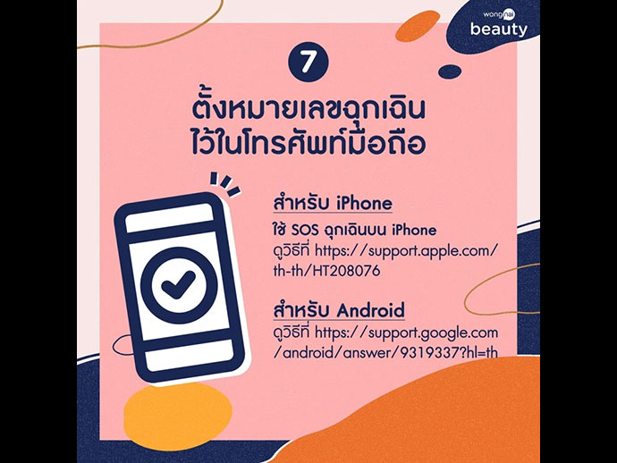 7. ตั้งหมายเลขฉุกเฉินไว้ในโทรศัพท์มือถือ สิ่งที่อยากให้ทุก ๆ คนหยิบมือถือขึ้นมาทำเลยทันที ไม่ว่าจะอยู่ในสถานการณ์ปกติหรือสถานการณ์คับขันก็ตามคือ การตั้งหมายเลขฉุกเฉินไว้ในโทรศัพท์มือถือ
