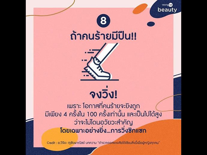 8. ถ้าคนร้าย มีปืน!! ในกรณีที่คนร้ายมีปืน ไม่ว่าจะอยู่ในระยะไกล หรือระยะประชิด จงวิ่ง!!! สถานเดียวเลยค่ะ เพราะโอกาสที่คนร้ายจะยิงถูกมีเพียง 4 ครั้งใน 100 ครั้งเท่านั้น และเป็นไปได้สูงว่าจะยิงไม่โดนอวัยวะสำคัญ โดยเฉพาะอย่างยิ่ง การวิ่งซิกแซก เลี้ยวไปเลี้ยวมาเพื่อหลบวิถีกระสุน ซึ่งยังไงก็มีโอกาสรอดได้มากกว่าเป็นเป้านิ่งแน่นอน! หวังว่าเคล็ดลับที่เรานำมาฝากทุกคนในวันนี้จะเป็นประโยชน์ไม่มากก็ไม่น้อยนะคะ ใครมีเคล็ดลับดี ๆ หรือเคยเจอประสบการณ์ที่อยู่ในสถานการณ์คับขัน มาคอมเมนต์เพื่อแชร์วิธีเอาตัวรอดกันได้ เพื่อน ๆ คนอื่นจะได้ความรู้ดี ๆ จากเราไปด้วย