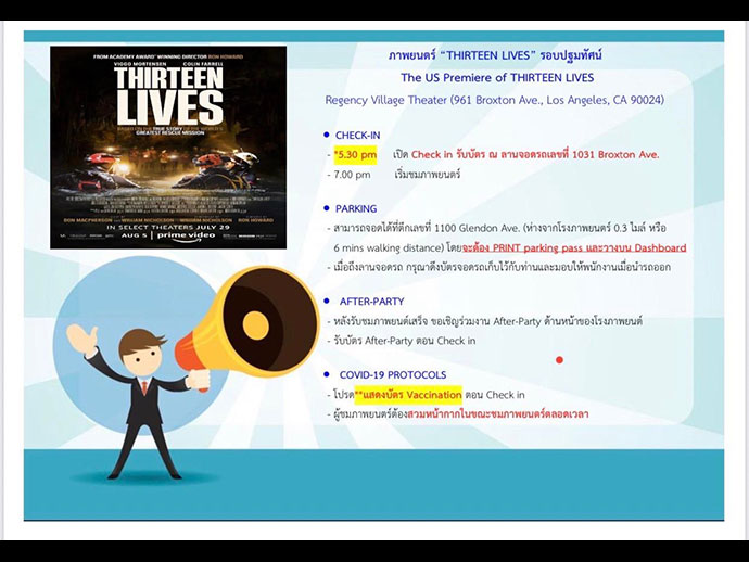 โชคดีจริงๆ ที่เมื่อวันที่ 28 สิงหาคมที่ผ่านมา ได้รับเชิญจากสถานกงสุลใหญ่แอลเอ ให้ไปร่วมชมภาพยนต์รอบปฐมทัศน์ Thirteen Lives หรือ 13 ชีวิตหมูป่าต้องรอด ในนามของ Thai Community ที่โรงภาพยนต์ Regency Village Theater เมือง Westwood