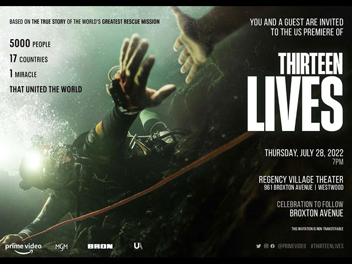 Thirteen Lives ภาพยนตร์ที่ดัดแปลงมาจากเหตุการณ์จริงของภารกิจช่วยชีวิตทีมฟุตบอลเยาวชนหมู่ป่าที่ติดอยู่ในถ้ำหลวง-ขุนน้ำนางนอนในปี 2561 โดยผู้กำกับรางวัลออสการ์ Ron Howard พร้อมผู้ช่วยหนุ่มคนไทย คุณ Raymond Phathanavirangoonปล่อยตัวอย่างแรก พร้อมวางกำหนดฉายแบบจำกัดโรงในวันที่ 29 กรกฎาคมนี้ และสามารถรับชมได้พร้อมกันทั่วโลกในวันที่ 5 สิงหาคมนี้ ทาง Prime Video
